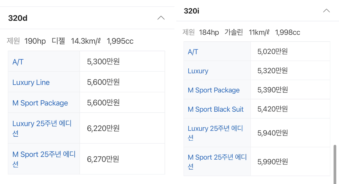 bmw 320i가 bmw 320d보다 더 저렴하기는 했다.