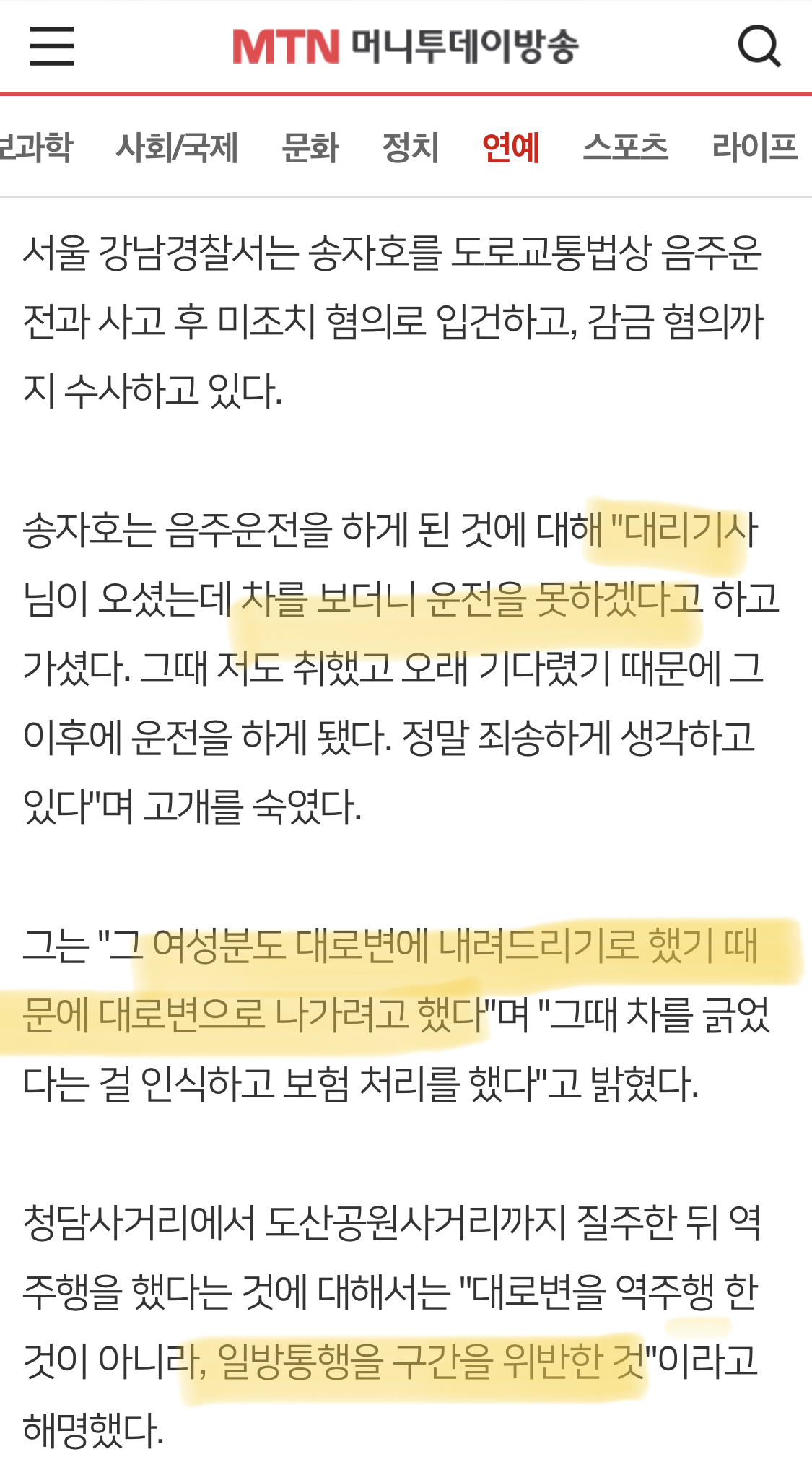 막 기사에는 송자호씨 음주운전, 역주행, 동승자 여성 감금 등 자극적인 내용들이 많으나 모두 음 사실과는 조금씩 차이가 있어보인다. 위 신문 기사들을 보면.