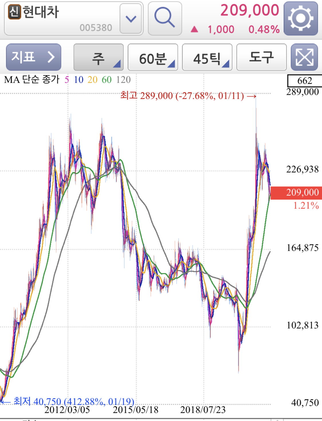 현대차 주가 차트가 개인적으로는 지금 고점이라 생각해서. 하지만 매도할 생각은 없다.