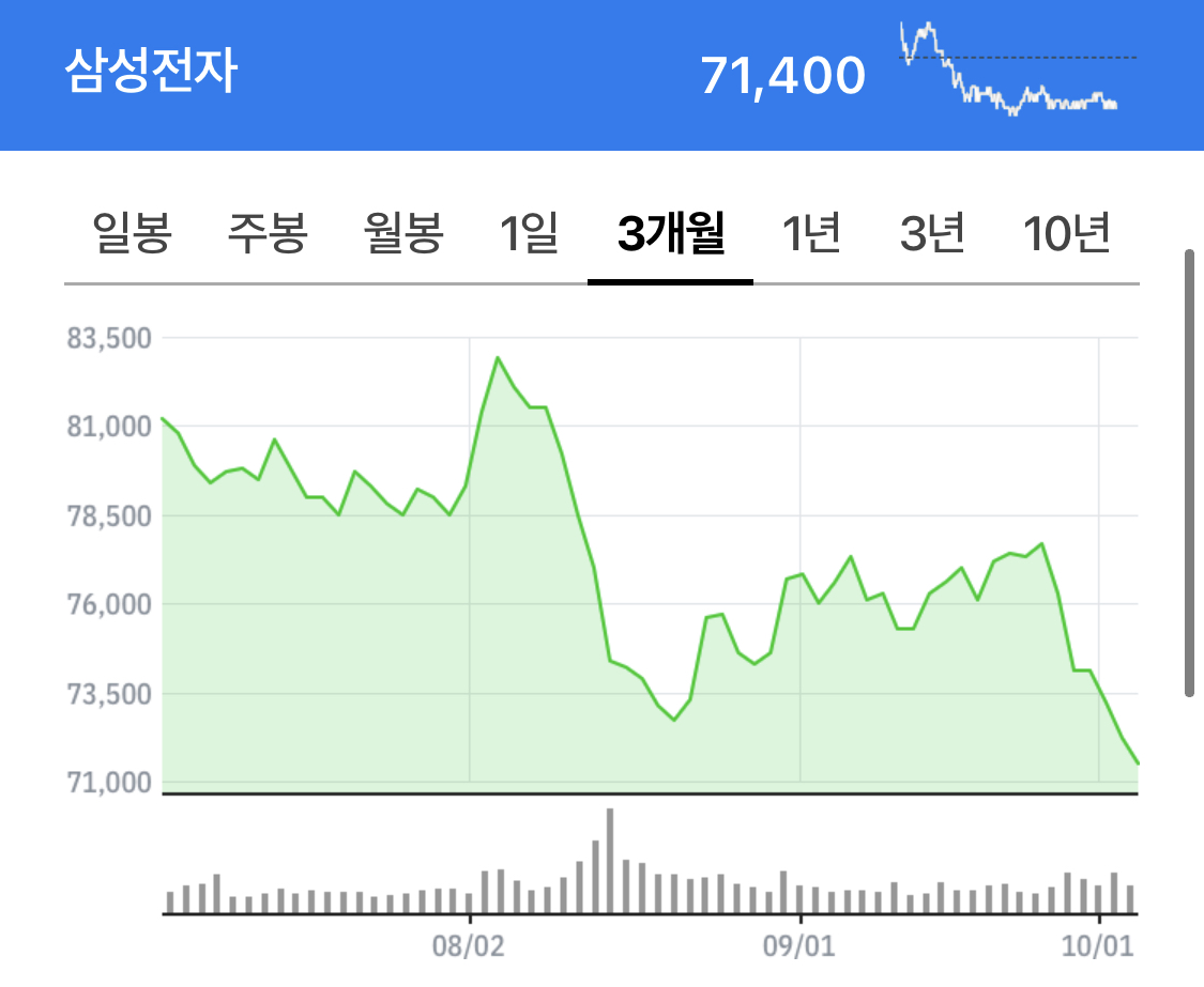그래도 9/27쯤에늠 삼성전자 주가가 76,000-77,000정도였는데 탈출했었어야 했나보다.