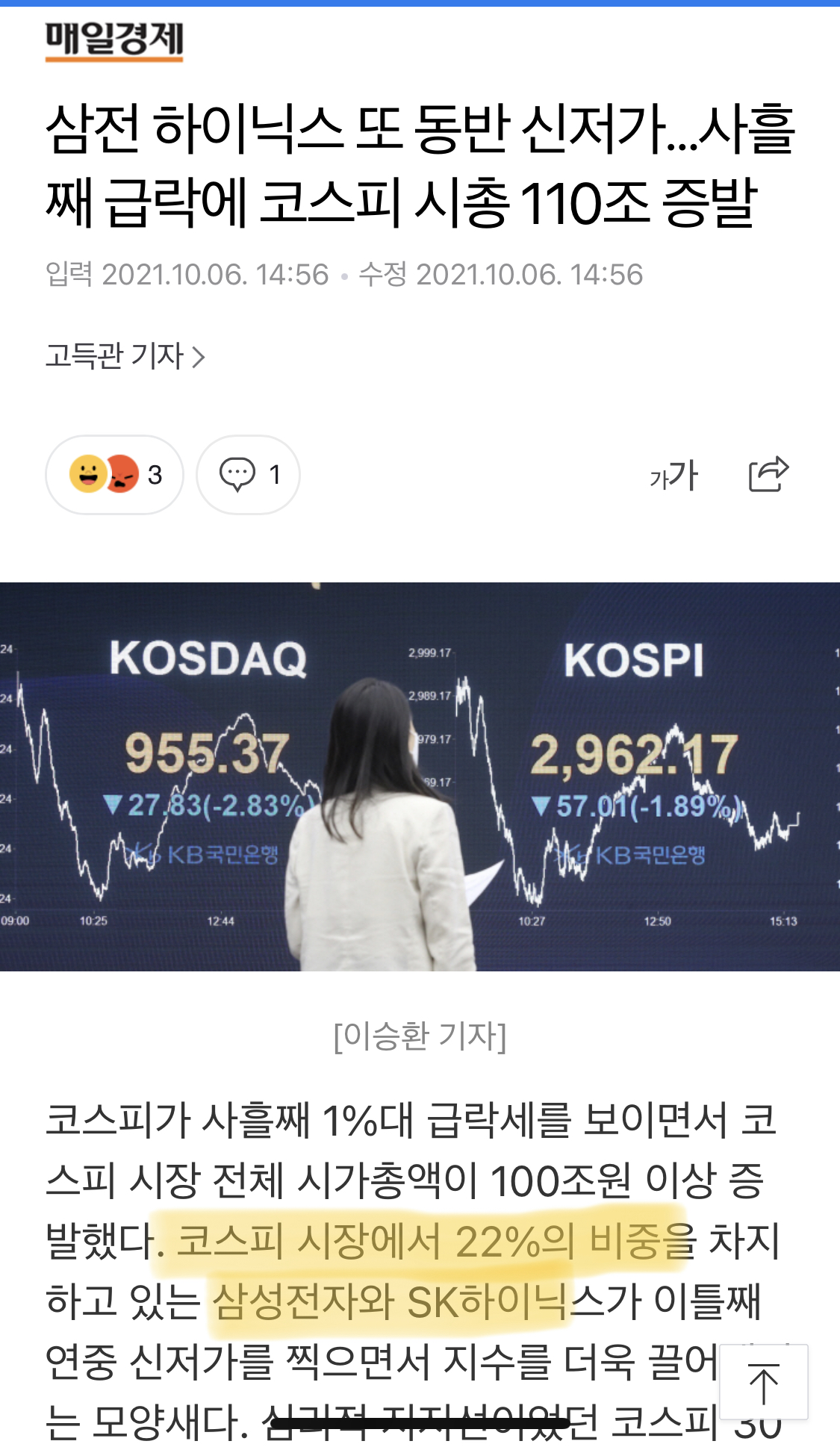 두 종목이 코스피 시작 22%를 차지하기 때문에
