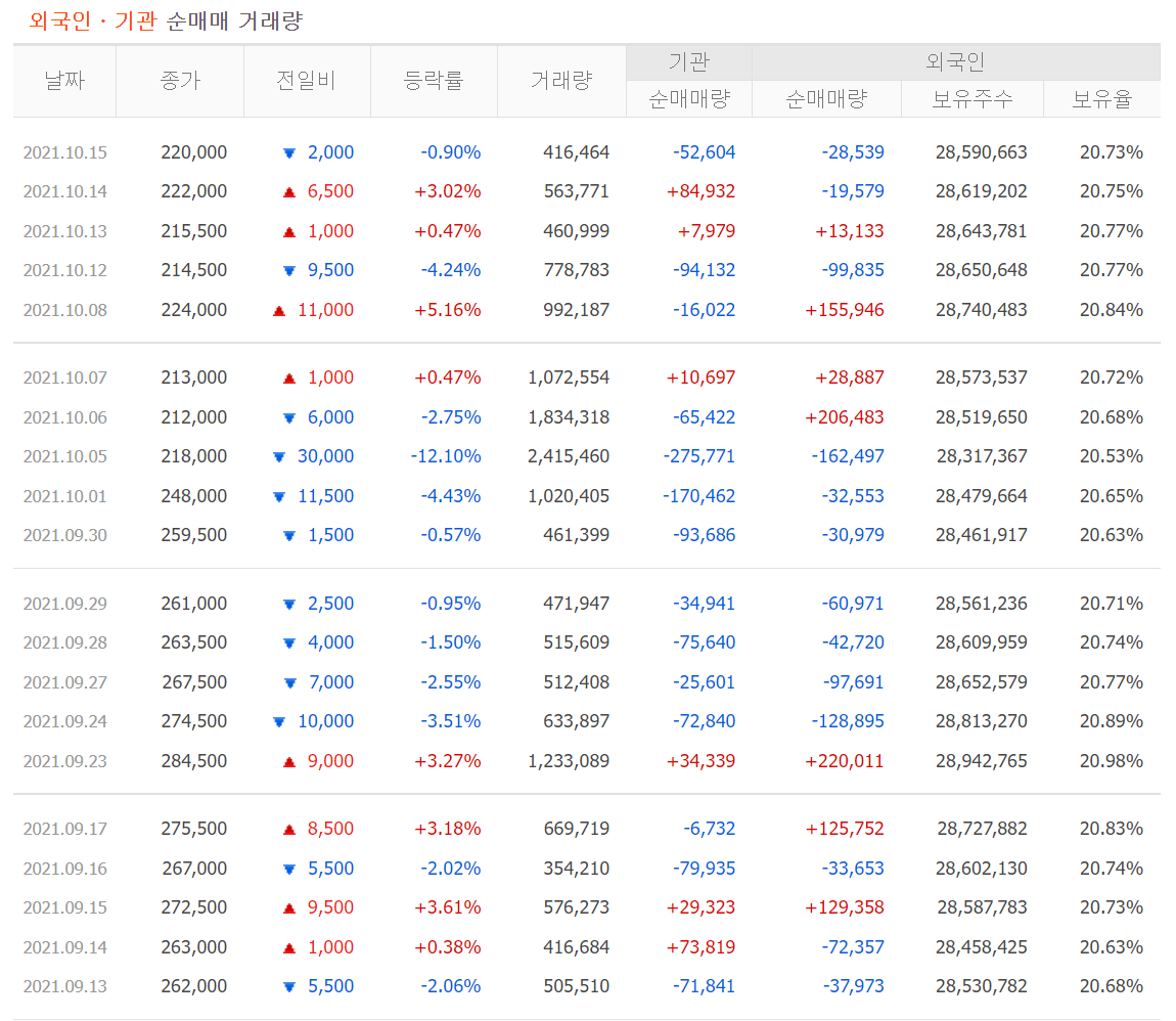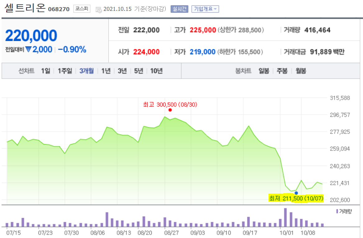 지난 주(10/7) 셀트리온 주가가 211,500까지 떨어졌었다.