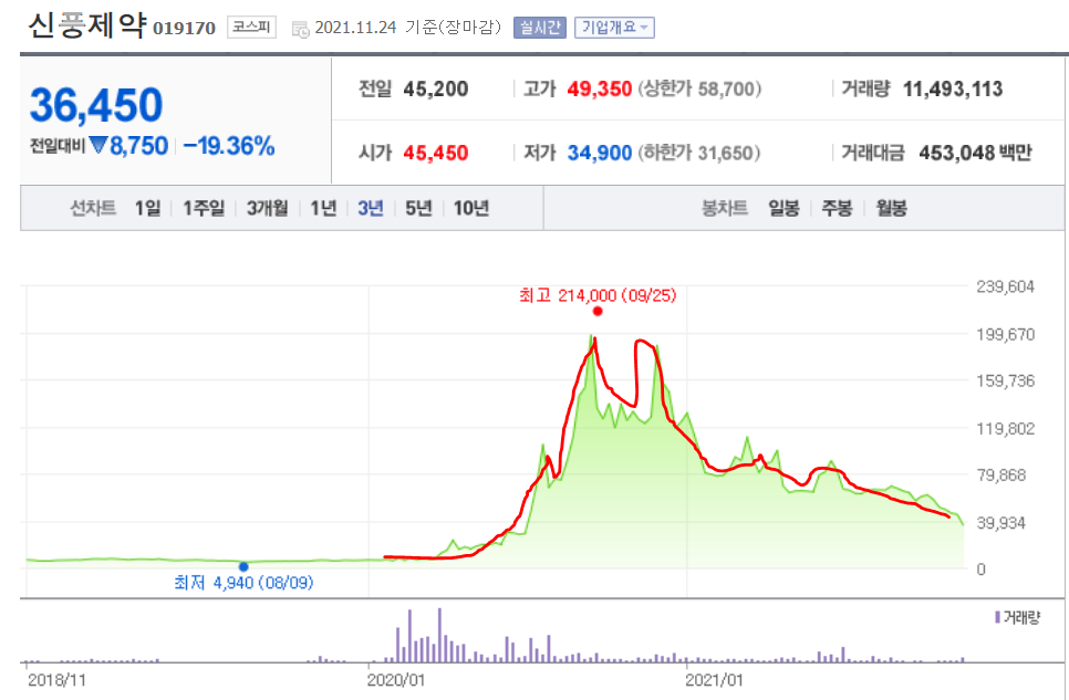 신풍제약 3년 주가 차트로 보면 지금 가격도 위태위태.