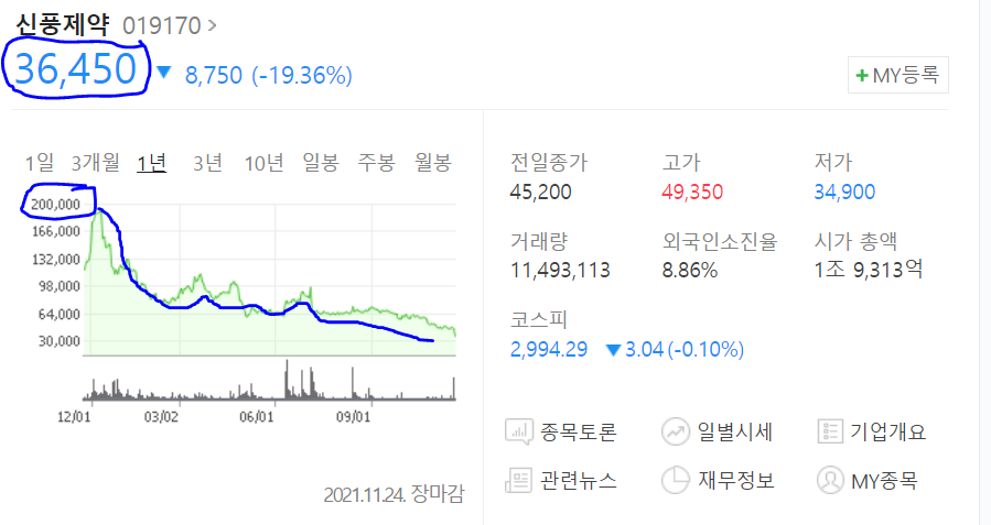 하지만 다시 신풍제약이 20만원대가 될지는...