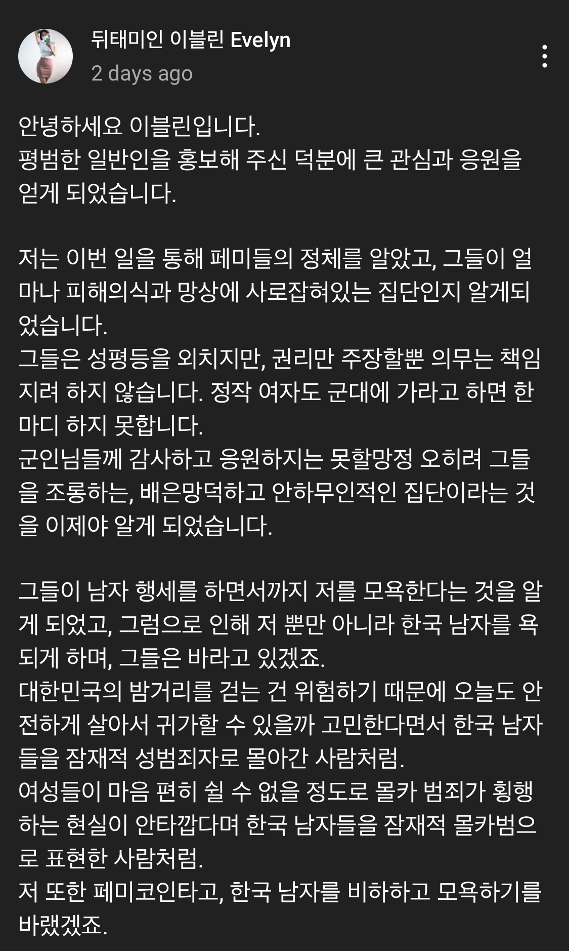 유튜브에서 밝힌 이블린(Evelyn) 최근 심경이다.