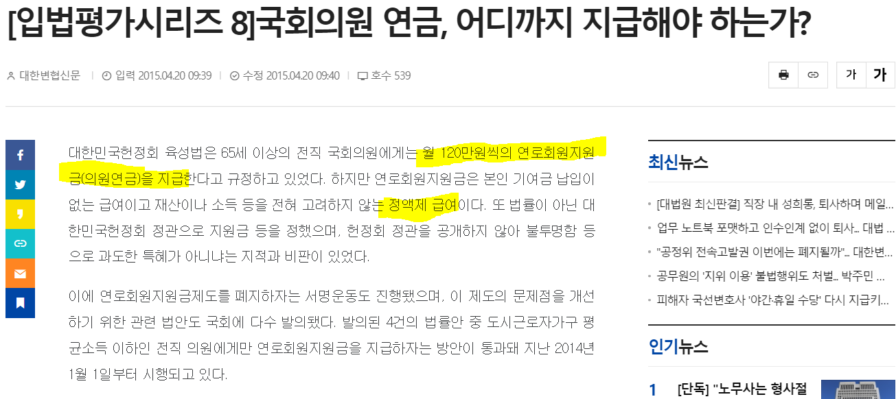 (국회의원이 받는 연금은 연로회원지원금(의원연금)인데 편의상 연금으로 말하겠다.)
