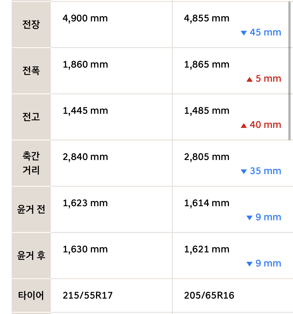 전장, 전폭, 전고, 윤거 전/후 크기가 다 다르다.