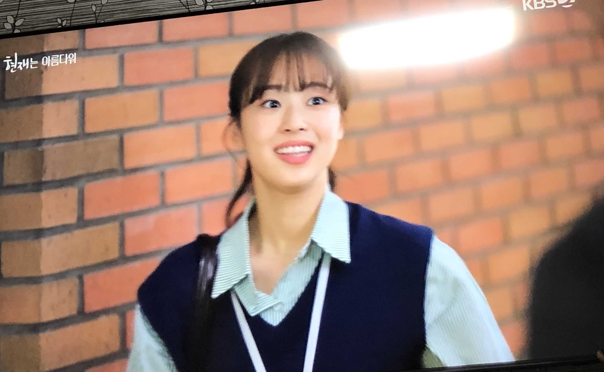 현재는 아름다워 최예빈 체크 셔츠에 블루 가디건