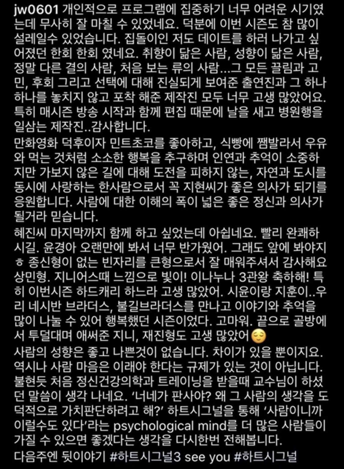 과거 양재웅은 하트시그널 박지현에게도 관심이 있었던 것 같아요. 물론 그 관심이 이성적인 관심이었는지 단순 비슷한 의사라는 공통사로 인한 후배에게 조언인지는 알 수 없지만요. 이런 장문의 글을 하트시그날 박지현에게만 남겼었네요.