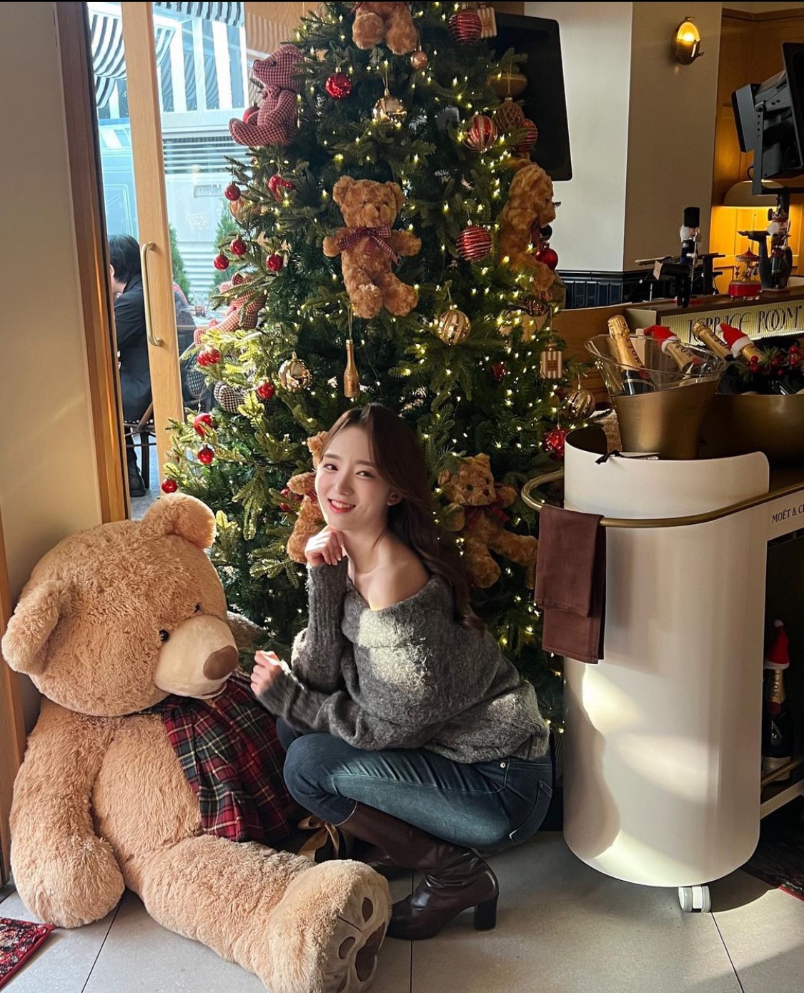 크리스마스 트리 앞에서의 박소연 아나운서.