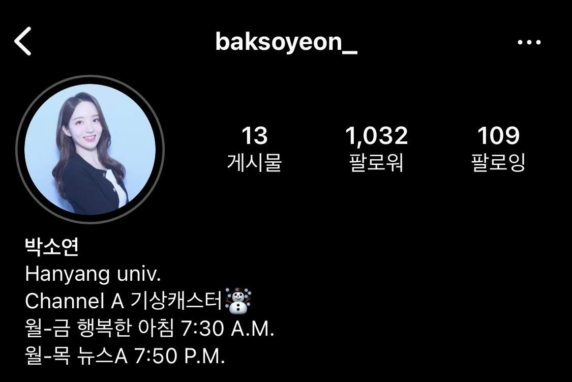 박소연 인스타 팔로워수도 아직은 높지 않아요. 아래 클릭하면, 박소연 기상캐스터 인스타 연결되요.