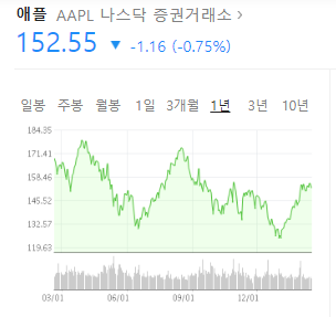 말 나온 김에 애플 주가 살짝 살펴보면, 애플은 오르락 내리락 하기는 하지만