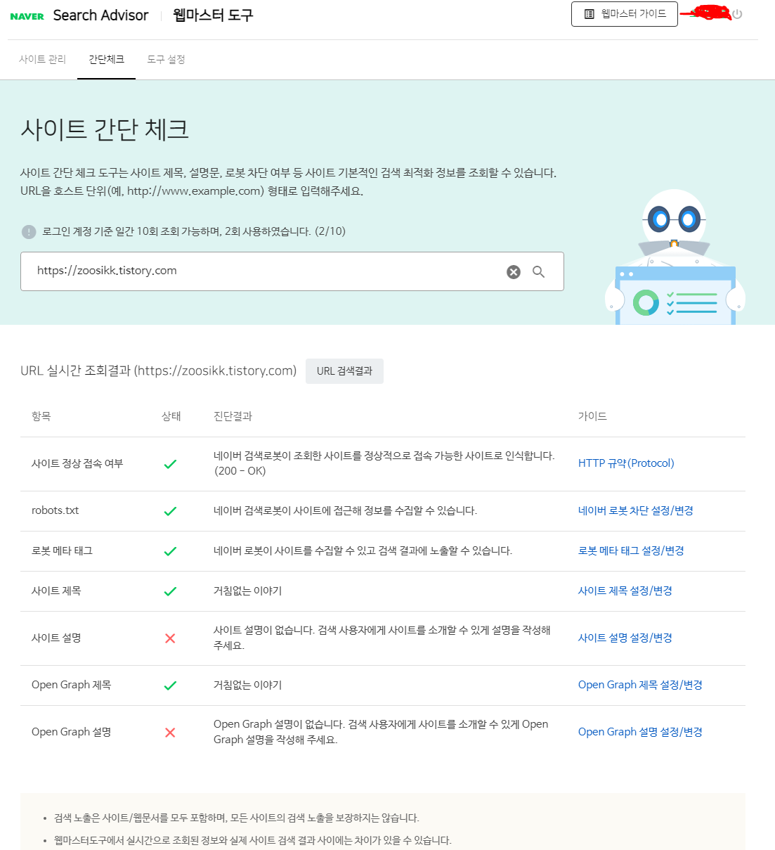 아 참고로 네이버 서치어드바이저 사이트 ㄱ산단 체크는 로그인 계정 기준 일간 10회만 가능하다고 하니