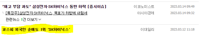 참고로 3.12기준, 코스피 외국인 상위 매도 1위 주식은 SK하이닉스라고 하네요.