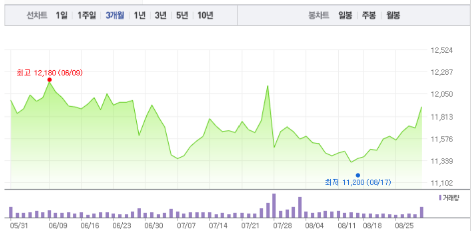 우리금융지주 3개월간 주가 흐름을 보면, 개인적인 판단에 지금이 저점같아 보이기는 합니다.