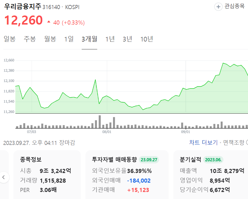 오랜만에 주식을 보았습니다. 여러 주식을 보다가 딱 눈길이 멈춘 주식은 우리금융지주. 일단 오늘 조금 오르긴 했네요. 23.8.31 종가 기준입니다. 사실 우리금융지주 주가 차트보다도 더 놀라운