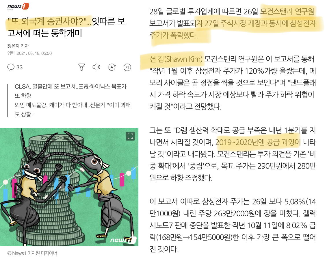 과거에도 모건스탠리가 비슷하게 삼성전자에 대해 안좋은 전망 보고서를 쓴 적이 있었는데 그 이후 엄청나게 주가가 빠졌더라.