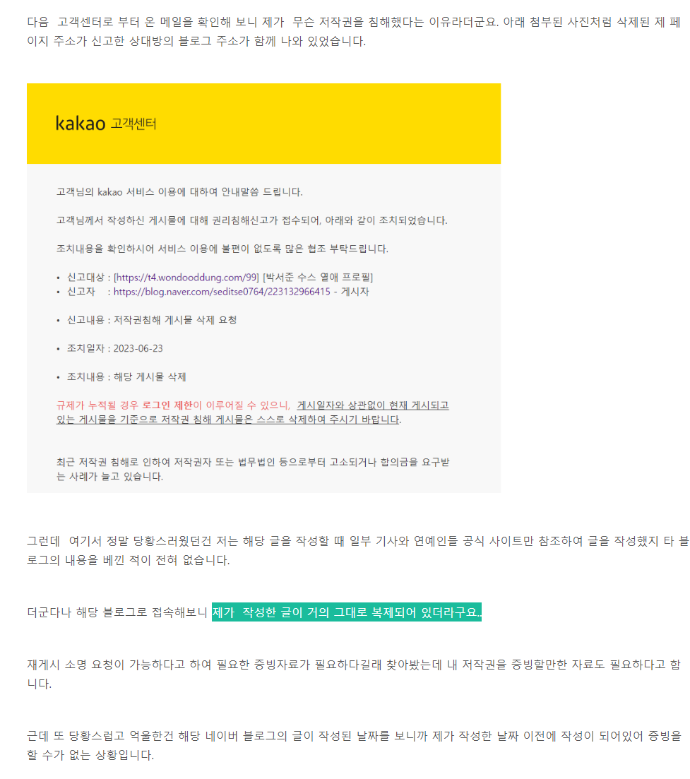 아니 카카오에서는 글의 작성 시간만 보면 바로 확인할 수 있는데 원작자에게 오히려 저작권 권리 침해를 했다고 하다니 너무나도 황당하다.