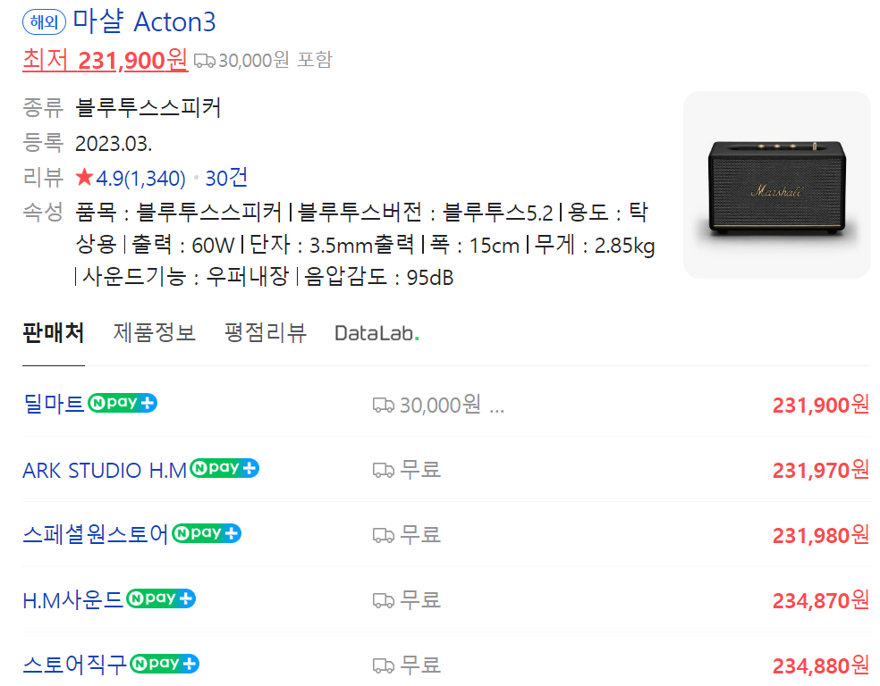 마샬 스피커 액톤3 원래 가격은 46만원이구나.