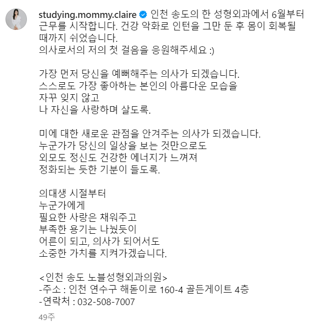 의대생 이도원 지금은 인천 송도의 한 성형외과에서 23.6월부터 근무를 시작했나 봅니다.