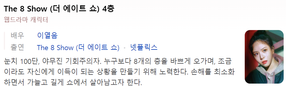 더 에이트 쇼 천우희 다음으로 인상 깊고 궁금한 케릭터가 이열음 아닌가 싶습니다.