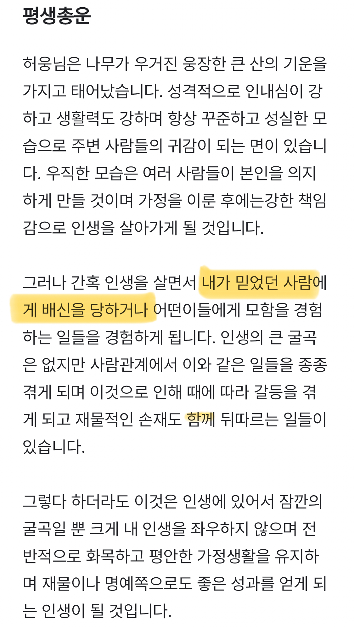정인의 특성이 또 사람을 천진난만하게 잘 믿는 것이니 허웅은 살면서 사람을 너무 믿지 않도록 하면 좋을 것 같습니다.