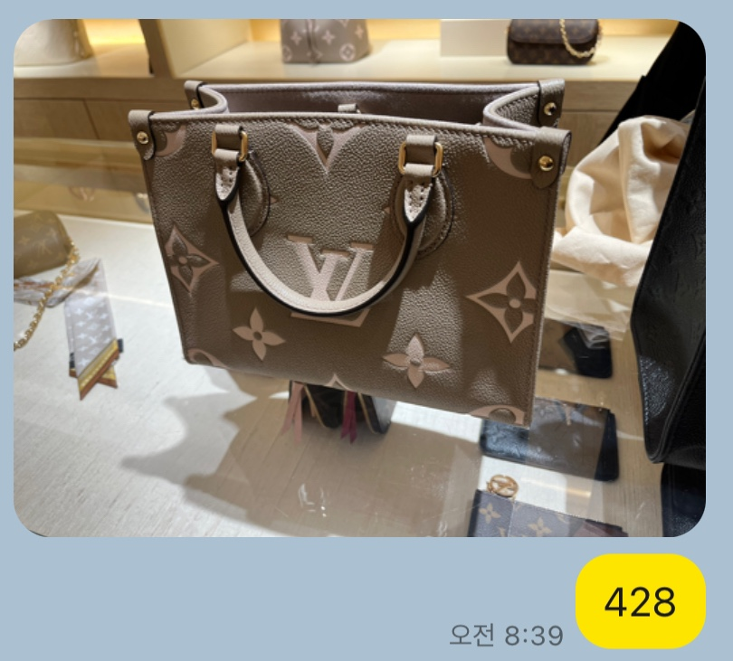 아래쪽 오른쪽 연한 갈색 루이비통 가방 가격은 428만원입니다.