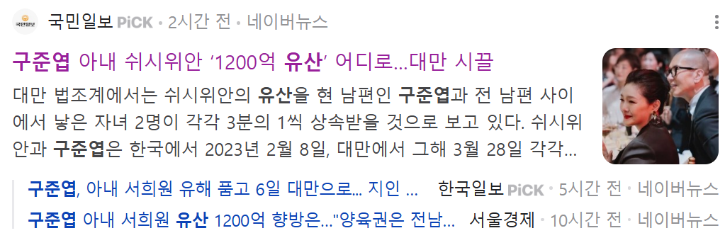 지금까지 보여준 구준엽의 모습을 보면 설마 돈 때문에 그런 나쁜(?) 생각을 하고 굳이 막 빠르게 결혼식, 혼인신고를 한 것은 아닌 것 같다. 또 그렇다고 믿고 싶다. 물론 쉬시위안의 전남편은 아닌 것 같기는 하지만.