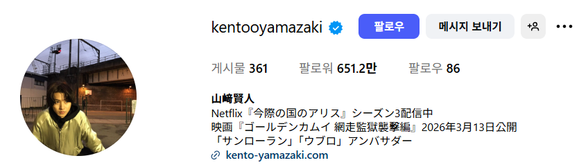야마자키 켄토 인스타 팔로우수가 무려 651.2만