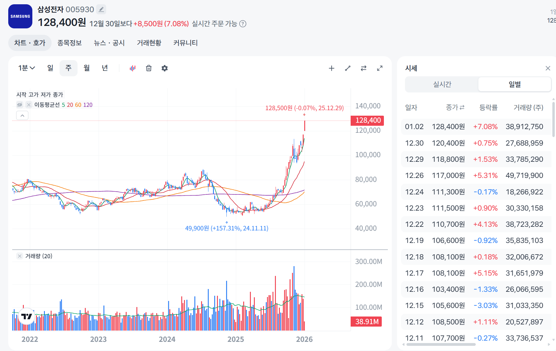 저는 지금 삼성전자 주가. 이미 고점이라고 생각되고 투자하기에는 다소 위험해 보이기도 합니다.